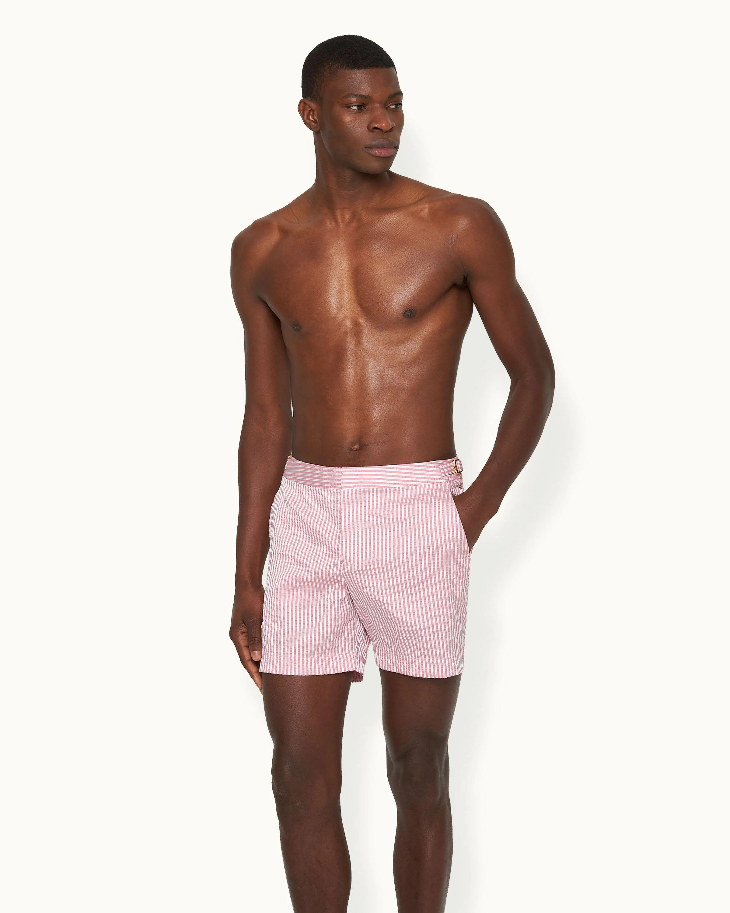 Overdue a style update? These statement Bulldogs are just the sunshine ordered. These mid-length swim shorts have white and pale pink textured stripes engineered into the material for flattering results. We've enhanced the design with a sleek gold-effect snap closure and adjustable side fasteners.