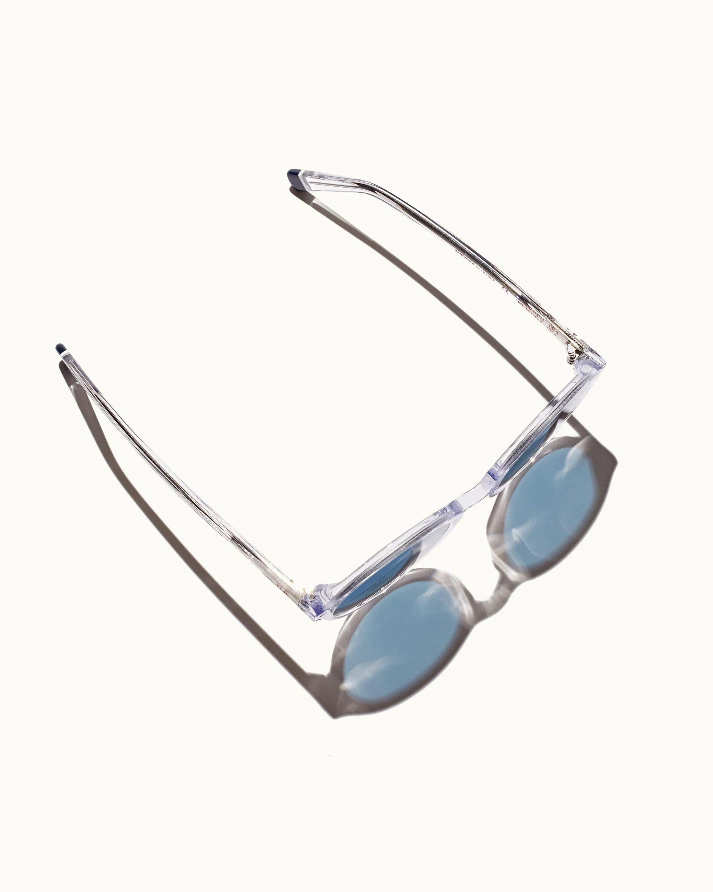 Boasting a bold Glacier blue lenses and clear frames, there retro-look circular sunglasses boast strong three-barrel hinges and our engraved logo on the temple.